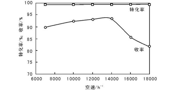 在常压、进口甲醇质量分数6.5%和反应温度300 ℃条件下, 考察空速对EQ-101型甲醛催化剂性能的影响, 结果见图2。