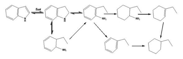 烯烃在加氢条件下主要发生加氢饱和以及异构化反应。这两类反应均可以提高产品的质量。烯烃通过加氢会生成烷烃, 通过异构化反应, 双键位置和烯烃链的空间结构发生变化, 生成的烷烃在加氢裂化条件下后续发生裂化和异构化反应。焦化汽油、焦化柴油和催化裂化柴油在加氢精制条件下, 烯烃的加氢反应很完全, 但并不是关键的加氢反应。烯烃的加氢以及后续异构反应历程为: