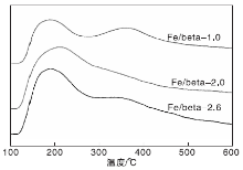 图5为Fe/beta-x分子筛的NH3-TPD谱图, 表2 为Fe/bete-x分子筛酸性表征结果。