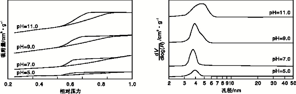 | 图4 不同沉淀pH值所得氧化铝样品的N2吸附-脱附等温线及孔径分布Figure 4 N2 adsorption-desorption isotherms and corresponding pore size distributions of Al2O3synthesized under different precipitation pH |