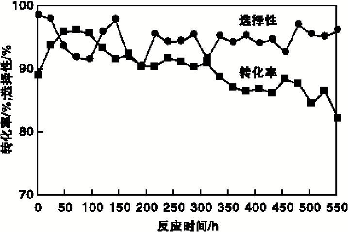 (5) 催化剂550 h稳定性试验结果显示, 转化率略降, 从约96%降至约82%, 乙腈选择性比较稳定, 保持在约95%, 催化剂活性未出现明显衰减。