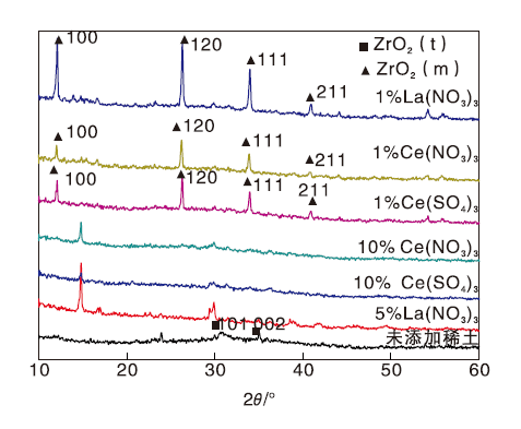 (3) 同铈相比, 添加镧对于ZrO2-SiO2中ZrO2晶体发生相变的抑制作用更大。