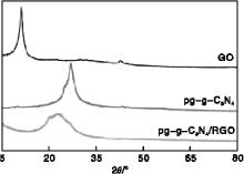图10是GO、pg-g-C3N4和pg-g-C3N4/RGO的XRD谱图。从图10可以看出, GO的峰出现在约10° , 与氧化石墨烯的XRD图相符合[18]。pg-g-C3N4在27.3° 和 10.5° 出现两个衍射峰, 分别对应石墨相材料的(100)和(002)晶面, 其中(100)晶面为共轭芳香体系层间堆积形成的特征峰, (002)晶面为层内基元结构周期性排列形成的特征峰, 均符合石墨相材料(JCPDS 87-1526)的特征峰[12]。pg-C3N4/RGO复合材料在约22° 出现一个宽的衍射峰, 表明氧化石墨烯在搅拌过程中被水合肼还原为还原氧化石墨烯, 同时发现位于26.5° 处的衍射峰可能是被22° 的强还原氧化石墨烯峰所覆盖而导致峰强度很弱, 表明pg-g-C3N4与RGO结合紧密, 复合物之间的相互作用明显。