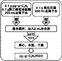 1.3.3 pg-g-C3N4/还原氧化石墨烯(RGO)复合材料的制备 称取0.1 g的pg-g-C3N4和0.1 g聚乙烯吡咯烷酮于500 mL烧杯中, 加入200 mL去离子水, 超声5 h形成分散液。同时再称取0.1 g氧化石墨(GO, 制备方法参考Hummers法[10])于另一装有200 mL去离子水的500 mL烧杯中, 超声5 h, 形成0.5 mg· mL-1的GO水分散液。之后混合超声, 再加入2 mL水合肼, 水浴锅80 ℃搅拌10 h, 离心, 水洗, 干燥即得pg-g-C3N4/RGO复合材料。具体制备过程如图2所示。