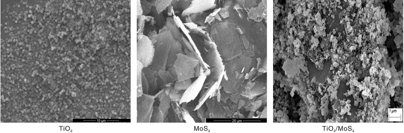 图3是TiO2、MoS2和TiO2/MoS2的SEM照片。