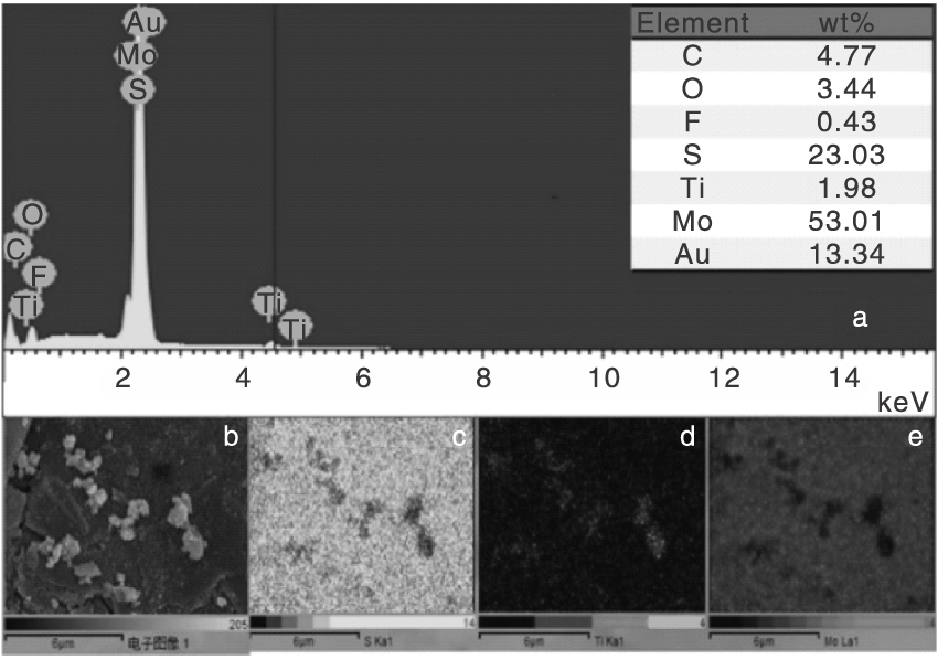 由图3可以看出, TiO2的形貌呈均匀颗粒球形状; MoS2是片层状形貌, 层与层之间的间隙保证了MoS2有较大的比表面积以及更多的反应点和反应边缘, 满足了对MoS2纳米材料性能的需求; TiO2/MoS2的TiO2颗粒均匀分布在MoS2片层表面, 表明TiO2已经负载到MoS2上。表面元素分析进一步证实负载情况。