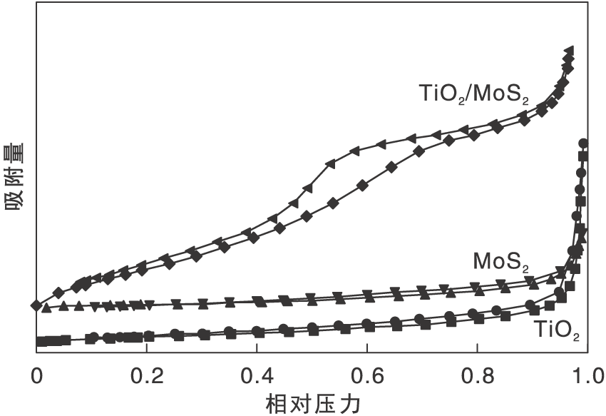 | 图6 TiO2、MoS2和TiO2/MoS2的N2吸附-脱附等温曲线Figure 6 Nitrogen adsorption-desorption isotherms of TiO2, MoS2 and TiO2/MoS2 |