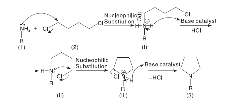 | 图9 伯胺和1, 4二氯丁烷的反应机理[49]Figure 9 Mechanism of the reaction between primary amine and 1, 4 dichlorobutane[49] |