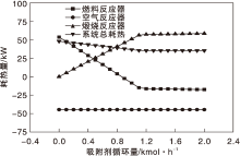 由图5可以看出, 空气反应器耗热并未因吸附剂循环量变化而受到影响, 基本保持不变; 燃料反应器耗热量随着循环量的提高逐渐减小, 煅烧反应器耗热量随着循环量的提高逐渐升高, 总耗热量随循环量的提高而有所减少至基本恒定。这是因为吸附剂含量提高时, 吸附反应和煅烧反应进行程度随之提高, 导致燃料反应器和煅烧反应器内耗热量的降低与提高, 总耗热量的减少则说明吸附过程促进了燃料反应器内的放热过程。放热量的提高大于煅烧反应内吸热的提高, 燃料的能量得到进一步释放。由此可知, 吸附剂循环量的提高有利于制氢, 且能够降低系统能耗, 促进燃料的能量释放。