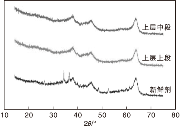 图2为新鲜催化剂与卸出催化剂样品的XRD图。由图2可以看出, 新鲜催化剂的特征峰比较明显, 而使用后催化剂特征峰已不明显。同时, 催化剂无明显的碳特征峰, 表明催化剂上的积炭仍属于无定型碳。