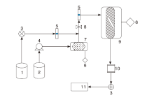 | 图2 催化剂活性评价装置 1.N2; 2.甲醇水溶液; 3.单向阀; 4.微型蠕动泵; 5.流量计; 6.温控仪; 7.蒸发腔; 8.不锈钢接头; 9.反应室; 10.冷凝净化器; 11.色谱仪Figure 2 Experimental apparatus |